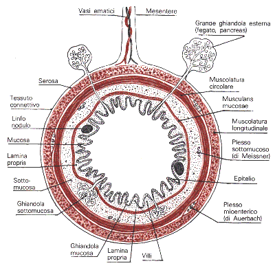 Dal punto di vista anatomo-funzionale, la struttura generale è analoga lungo tutto il tubo digerente, con la sola eccezione della bocca che ha una struttura ed un ruolo estremamente specifici. Il canale digerente è un tubo costituito da una doppia parete di muscolatura liscia (vedi figura a lato): lo strato più esterno è costituito da fibre ad andamento longitudinale, mentre in quello più interno le fibre muscolari sono circolari. La funzione di questa muscolatura è duplice: assicura l'avanzamento del cibo lungo il tubo digerente e lo rimescola, in modo che gli enzimi lo possano attaccare più agevolmente. L'interno del canale digerente è rivestito da una mucosa, variamente differenziata nei diversi tratti del tubo digerente. Subito sotto questa mucosa c'è un terzo strato di muscolatura, molto più sottile degli altri due e ad andamento longitudinale, detto muscolaris mucosae, che probabilmente ha una funzione difensiva. Nello spessore della parete del canale digerente troviamo due plessi nervosi: uno è subito all'interno dello strato muscolare circolare, ed è detto plesso sottomucoso o di Meissner; l'altro è tra i due strati principali di muscolatura ed è chiamato plesso mienterico o di Auerbach. Questi due plessi, formati prevalentemente da fibre nervose parasimpatiche, controllano e coordinano la motilità e le secrezioni del canale digerente.