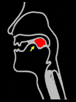 Quando il cibo è stato sufficientemente sminuzzato ha inizio il processo della deglutizione. Questo è un processo complesso, controllato volontariamente nella sua prima parte, ed invece completamente involontario, e quindi automatico e non controllabile, nella sua seconda parte. Inizialmente la lingua spinge la massa di cibo masticato verso il faringe (fotogrammi 1, 2 e 3 dell'animazione qui a fianco), e da questo punto in poi gli eventi si susseguono in maniera riflessa, quindi involontaria. Gli eventi principali di questo riflesso sono i seguenti: 1) sollevamento del palato molle, allo scopo chiudere posteriormente le vie nasali (fotogrammi 2-7); 2) rilasciamento della muscolatura della parte iniziale dell'esofago (fotogrammi 3-6); 3) avvicinamento delle corde vocali e chiusura dell'epiglottide, per impedire che il cibo entri nella trachea (fotogrammi 5-8); 4) contrazione dei muscoli del faringe che in tal modo forzano il cibo nell'esofago (fotogrammi 6 -8). Da questo punto in poi il cibo continua a scendere nell'esofago (fotogrammi 9 e 10).
